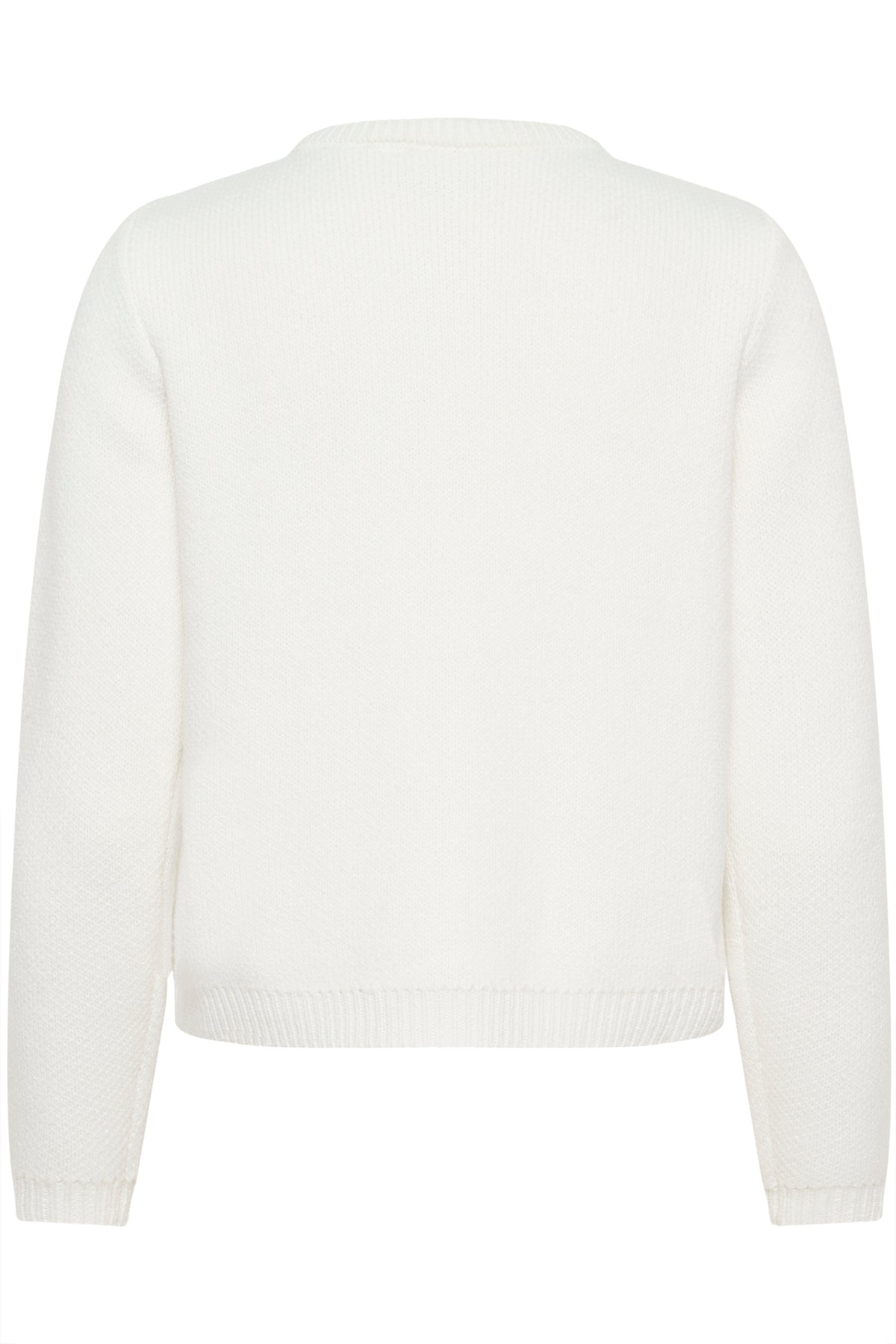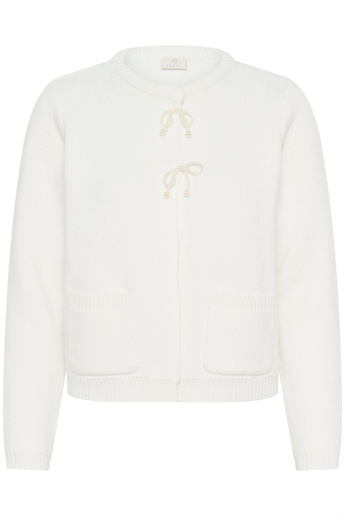 Ce haut en tricot présente une coupe droite et une texture douce qui ajoute une touche raffinée au quotidien. Elle offre une encolure ronde, des manches longues, deux poches appliquées à l’avant et deux liens ornés de petites perles comme fermeture. L’ourlet et les poignets sont côtelés pour une finition soignée