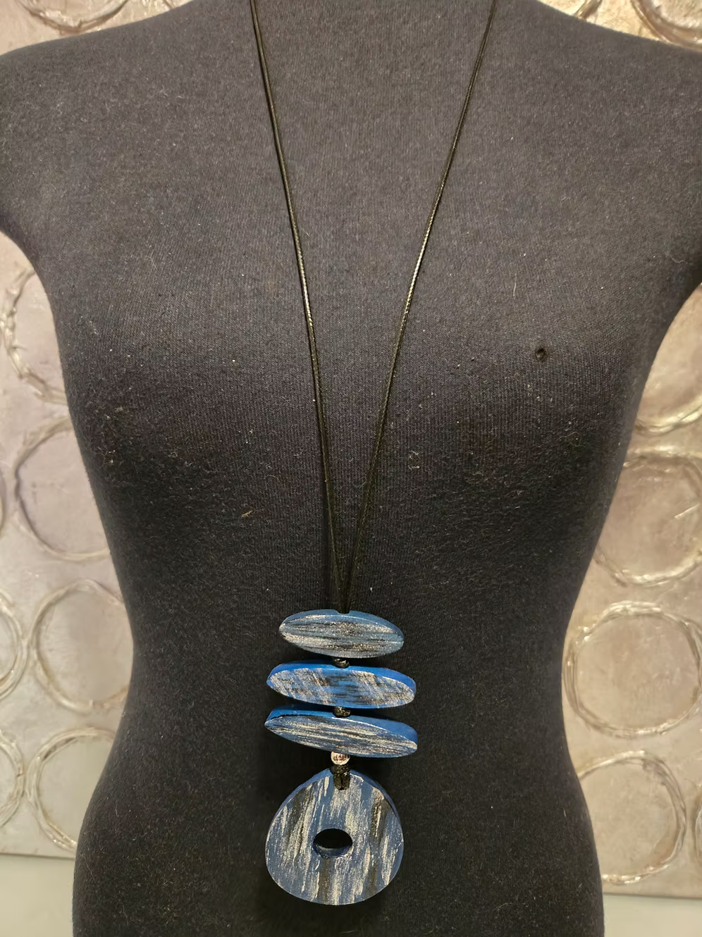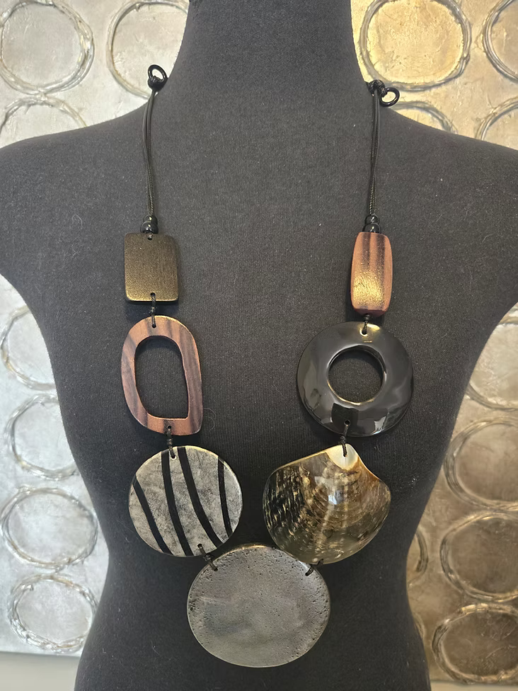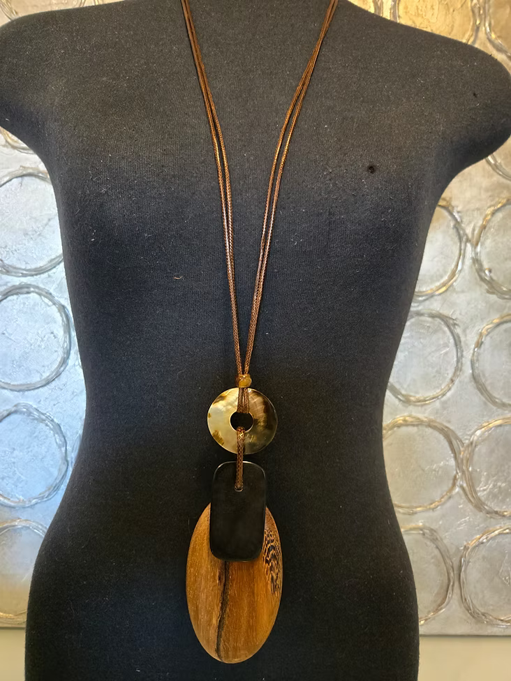 Collier avec cordes, pièces de bois et pastille tachetée