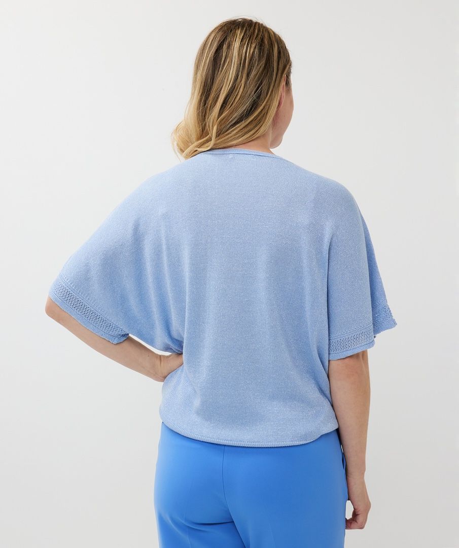 Le chandail à manches courtes style chauve-souris séduit par ses manches distinctives, amples et légères, qui dessinent un drapé d'une fluidité captivante. Ces manches volumineuses s’étendent avec grâce autour des bras, insufflant à la pièce à la fois une aura de raffinement et une sensation d’aise absolue. Le mouvement fluide qu’elles créent s’harmonise parfaitement avec la coupe ajustée au niveau des épaules, offrant ainsi une silhouette équilibrée, où chaque geste se fait avec légèreté et naturel.