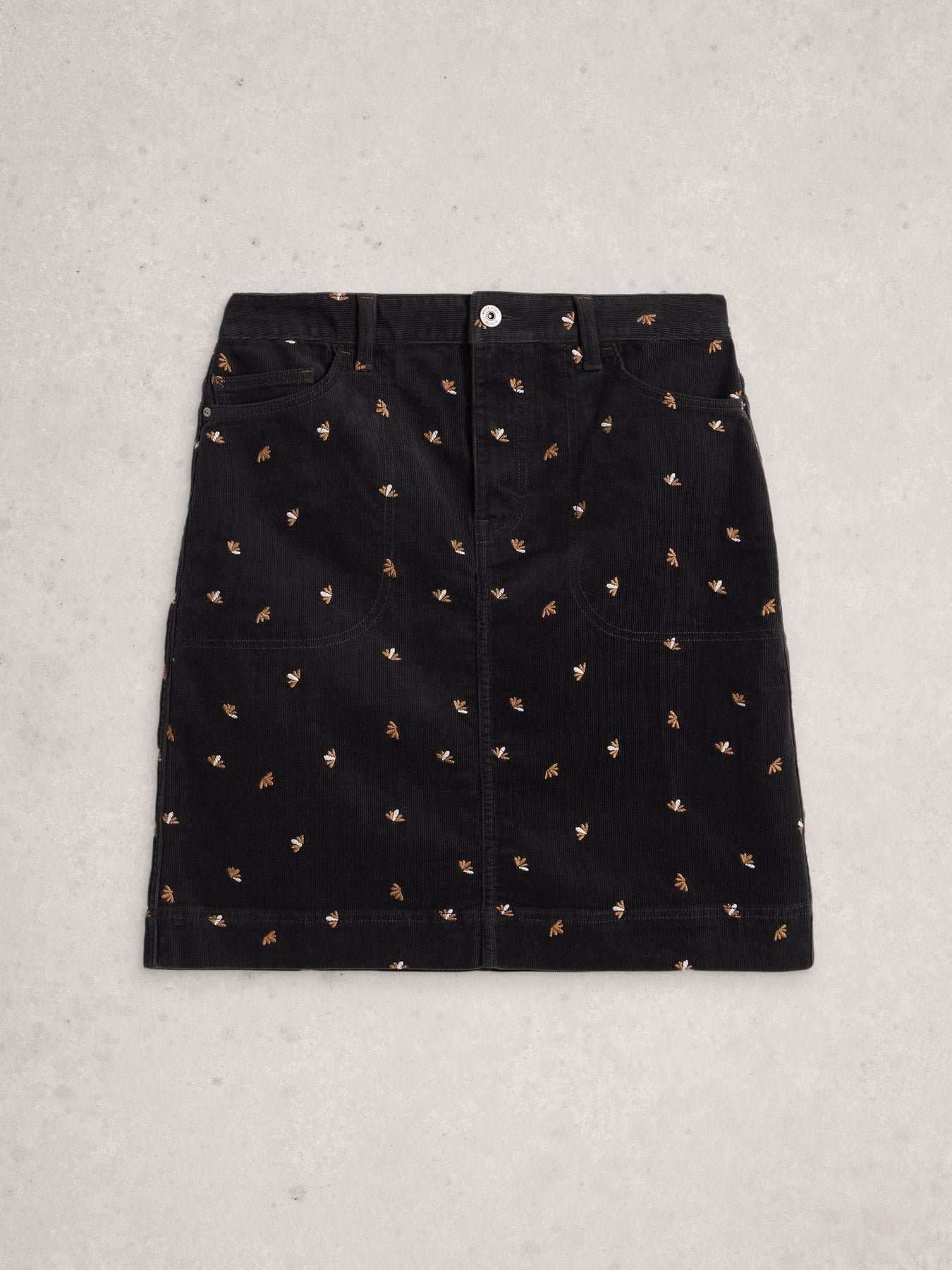 Confectionnée en velours côtelé de coton biologique avec une touche de stretch, elle séduit par sa teinte gris charcoal subtilement texturée et ses broderies florales délicates. Sa coupe classique et sa longueur genoux en font une pièce facile à porter au quotidien, tout en ajoutant une touche féminine à vos tenues automnales.