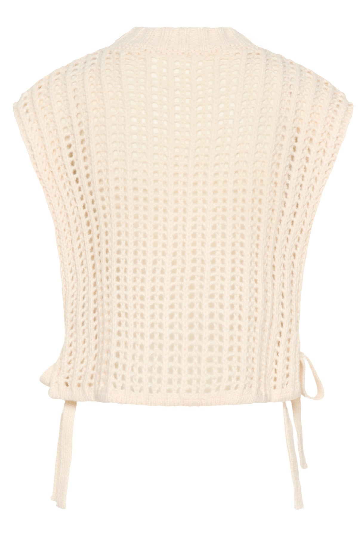 Ce tricot sans manches présente une coupe ample, un col rond et un motif ajouré qui apporte une touche moderne à vos superpositions. Les liens ajustables sur les côtés permettent de personnaliser la silhouette et d’assurer un confort polyvalent au quotidien.