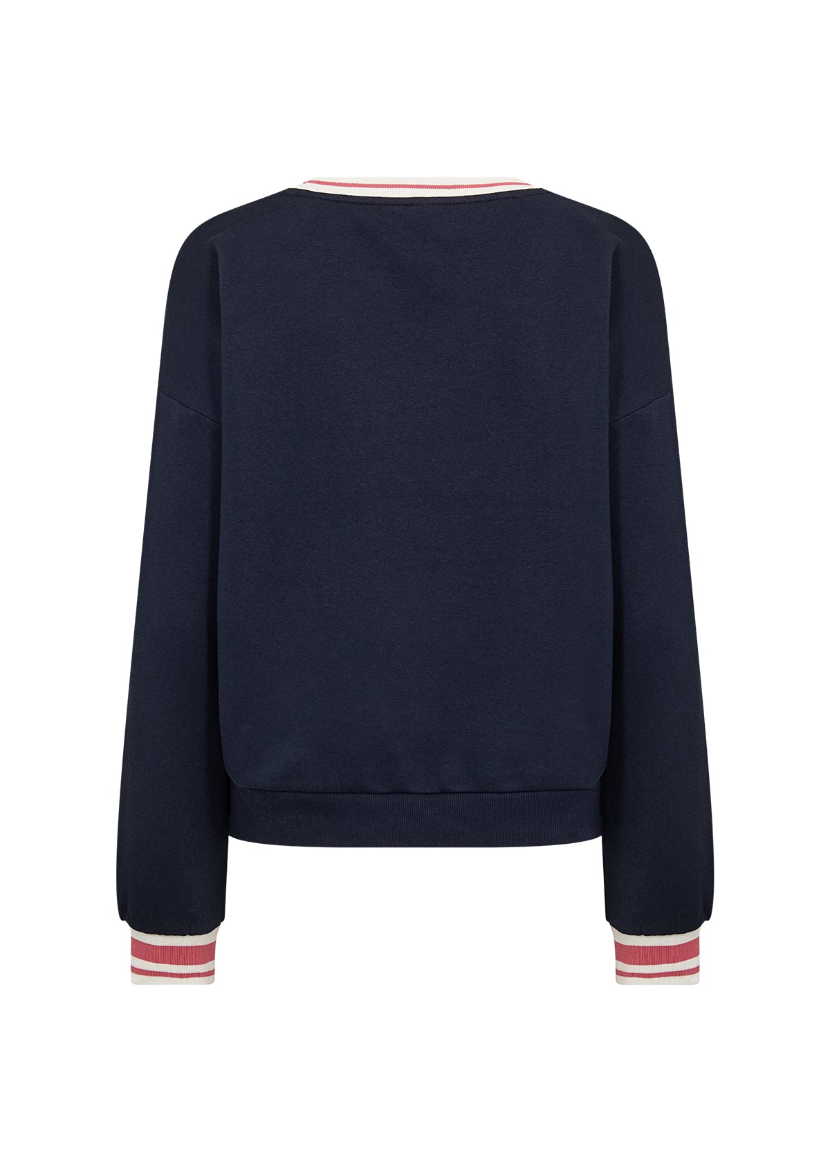 Conçu dans un tissu doux mélangeant coton biologique et polyester recyclé. Il présente un col rond simple et des poignets côtelés avec rayures contrastantes. Portez-le avec un jean ou un pantalon confortable pour un look décontracté et stylé.