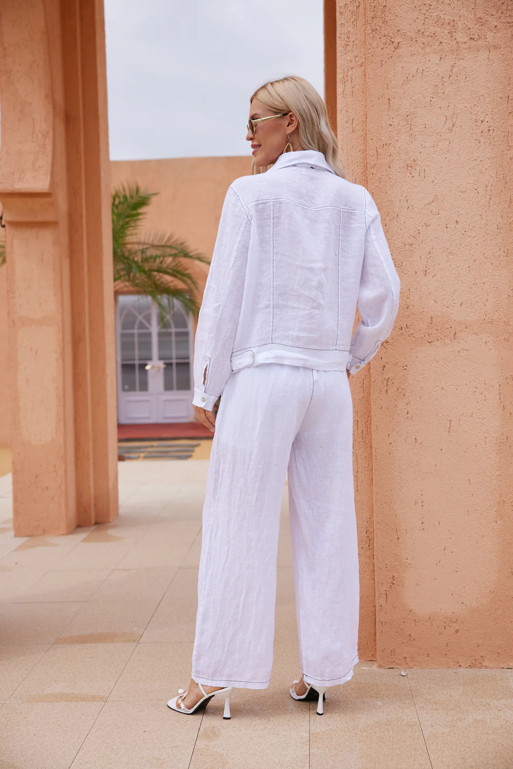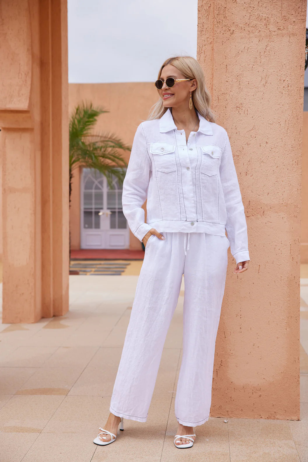 Cette veste et ses fines lignes noires soulignent les contours et rappellent le design minimaliste du haut et du pantalon assortis, créant une silhouette parfaitement coordonnée. Sa coupe nette apporte une présence sophistiquée, idéale pour rehausser autant un look de jour qu’une tenue de soirée. Une pièce clé qui donne instantanément une finition professionnelle et chic.