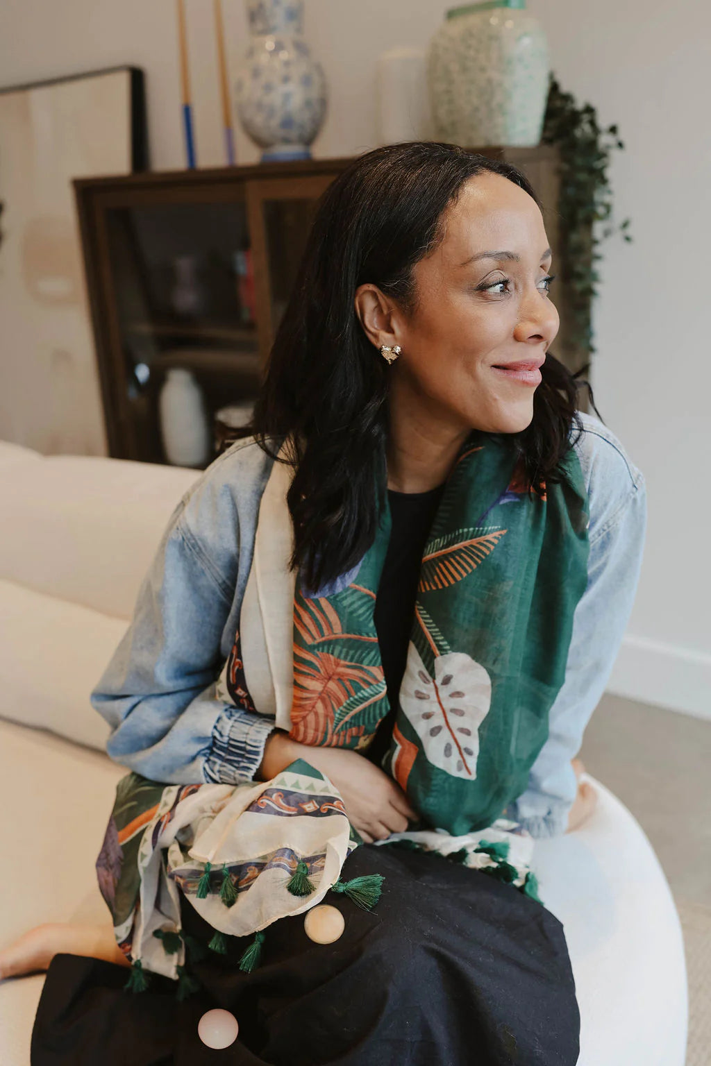 Écharpe légère multicolore à imprimé - Accessoire éclectique avec pompons
