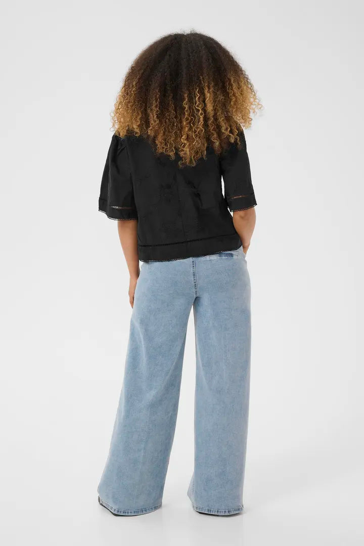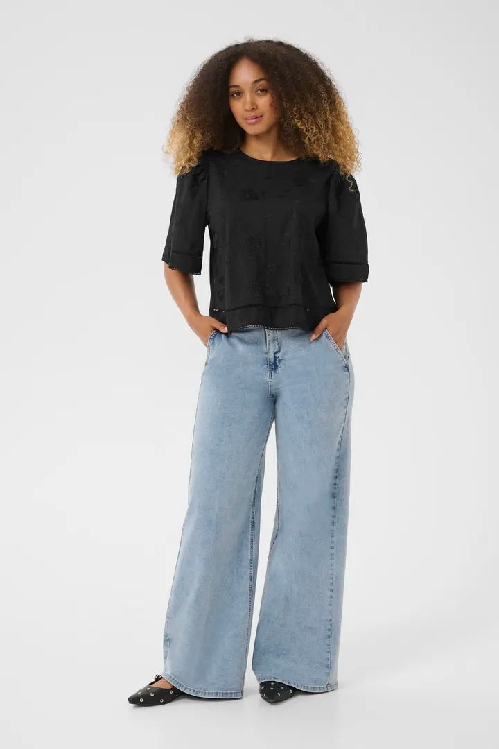 Cette blouse révèle ses détails dans la douceur et la retenue. Son motif floral, entièrement brodé dans un jeu de ton sur ton, se devine plus qu’il ne s’impose — comme une texture secrète, révélée par la lumière et le mouvement. Chaque fleur semble surgir du tissu avec subtilité, ajoutant du relief sans contraste marqué. La matière, légère et fluide, laisse respirer la peau tout en apportant une touche raffinée et presque tactile. C’est une pièce qui mise sur le détail silencieux, le raffinement discret : parfaite pour celles qui aiment que l’élégance se dise à voix basse.