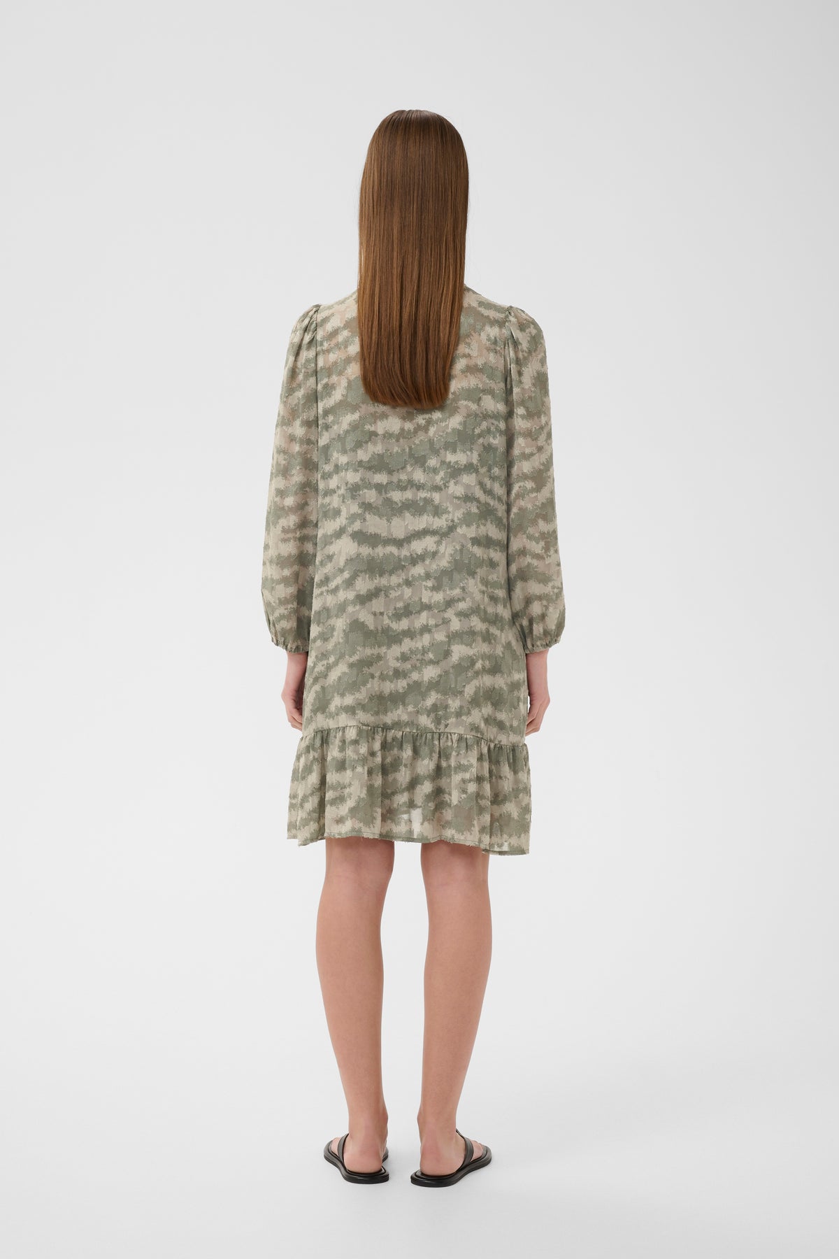 Cette robe se distingue par un motif tigré délicat décliné dans des nuances basilic. Sa matière légère accompagne naturellement le mouvement et crée une silhouette aérienne, tandis que la longueur au-dessus du genou apporte une allure dynamique et actuelle. Une robe pensée pour composer des tenues spontanées et expressives.