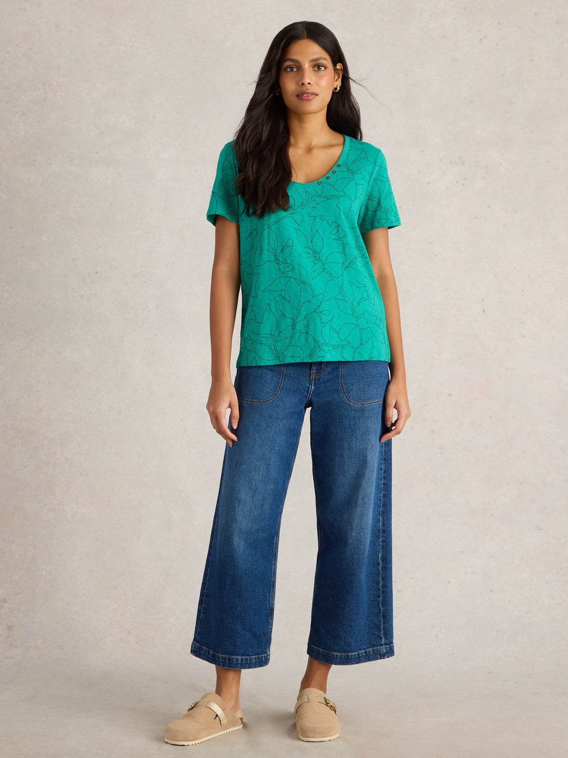Ce modèle intemporel réinvente la simplicité avec une touche subtile de sophistication grâce à ses boutons délicatement placés, qui ajoutent une note d'originalité à ce basique. Le col rond, classique et rassurant, vous offre une silhouette nette et aérée, tandis que les boutons ajoutent un petit détail qui fait toute la différence