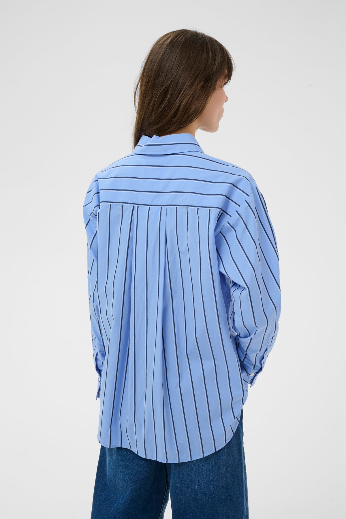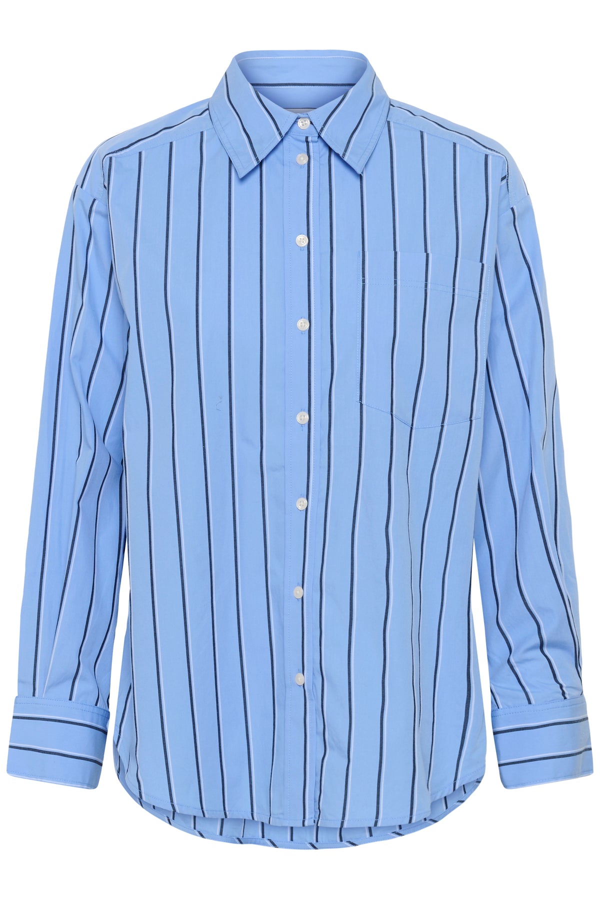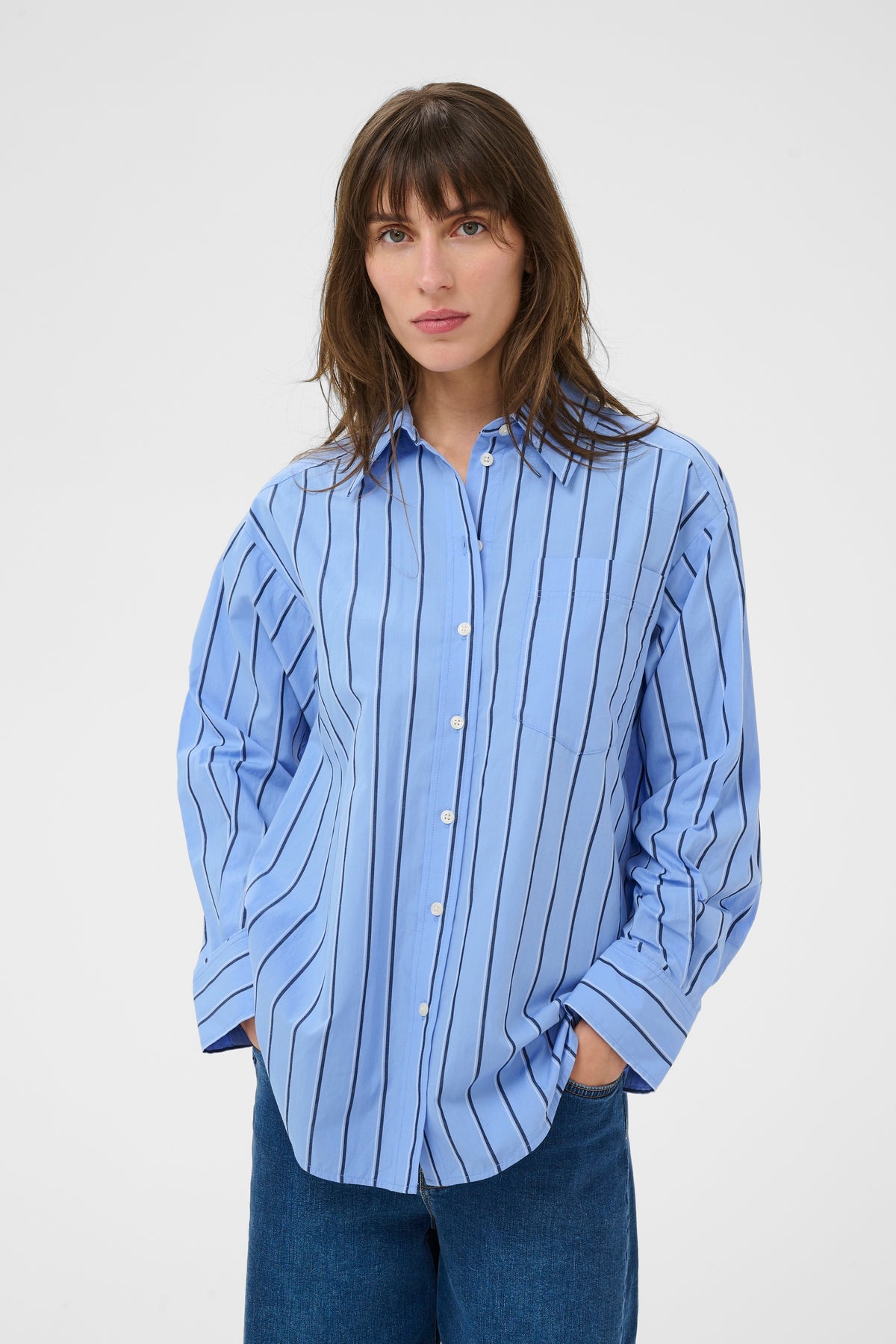 Cette blouse est une pièce intemporelle qui s’intègre facilement à toutes les garde-robes. Confectionnée en coton biologique, elle offre une sensation naturelle et agréable sur la peau. Ses rayures bleues apportent une touche classique et lumineuse, tandis que sa coupe régulière assure un porté confortable et soigné, parfait autant pour le quotidien que pour une tenue plus travaillée.
