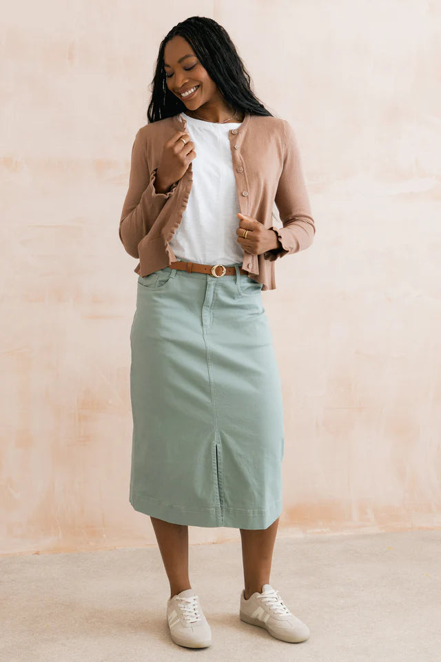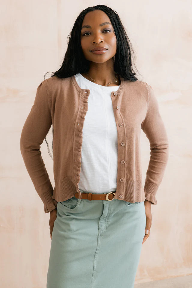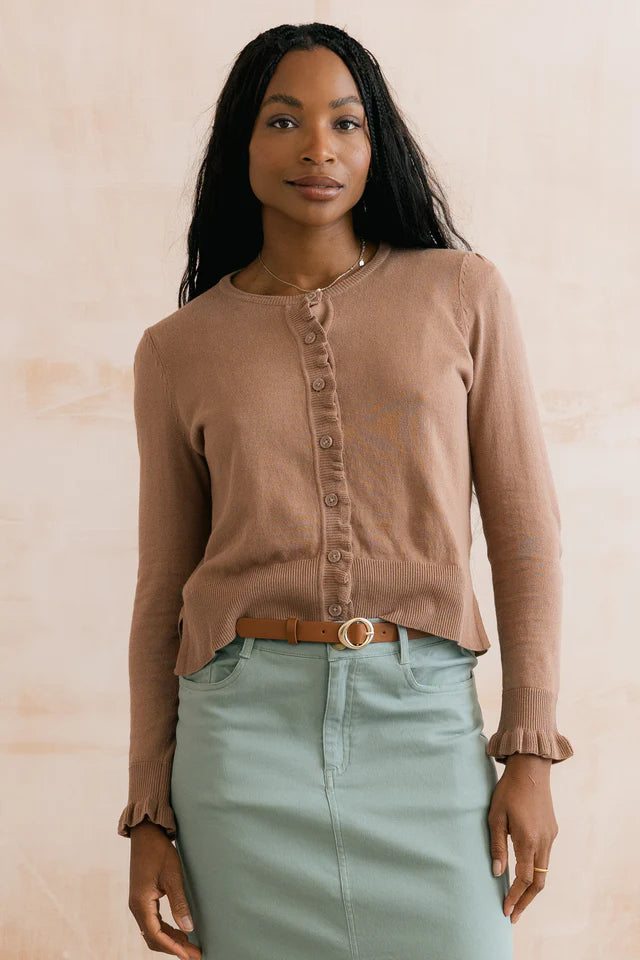 Ce tricot est une pièce polyvalente et confortable, idéale pour les journées plus douces. Confectionné en 100 % coton biologique, il offre une texture légère et respirante qui se prête parfaitement aux superpositions. Ses détails délicats — légers froncés aux épaules, finition festonnée et boutons effet corne — ajoutent une touche féminine subtile. Facile à agencer, il complète aussi bien une robe imprimée qu’un ensemble plus épuré.