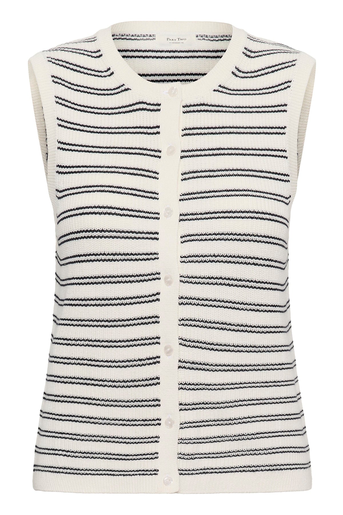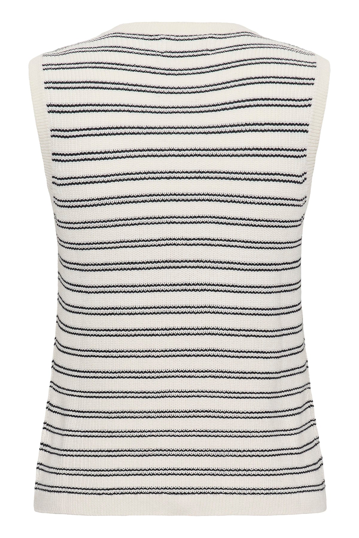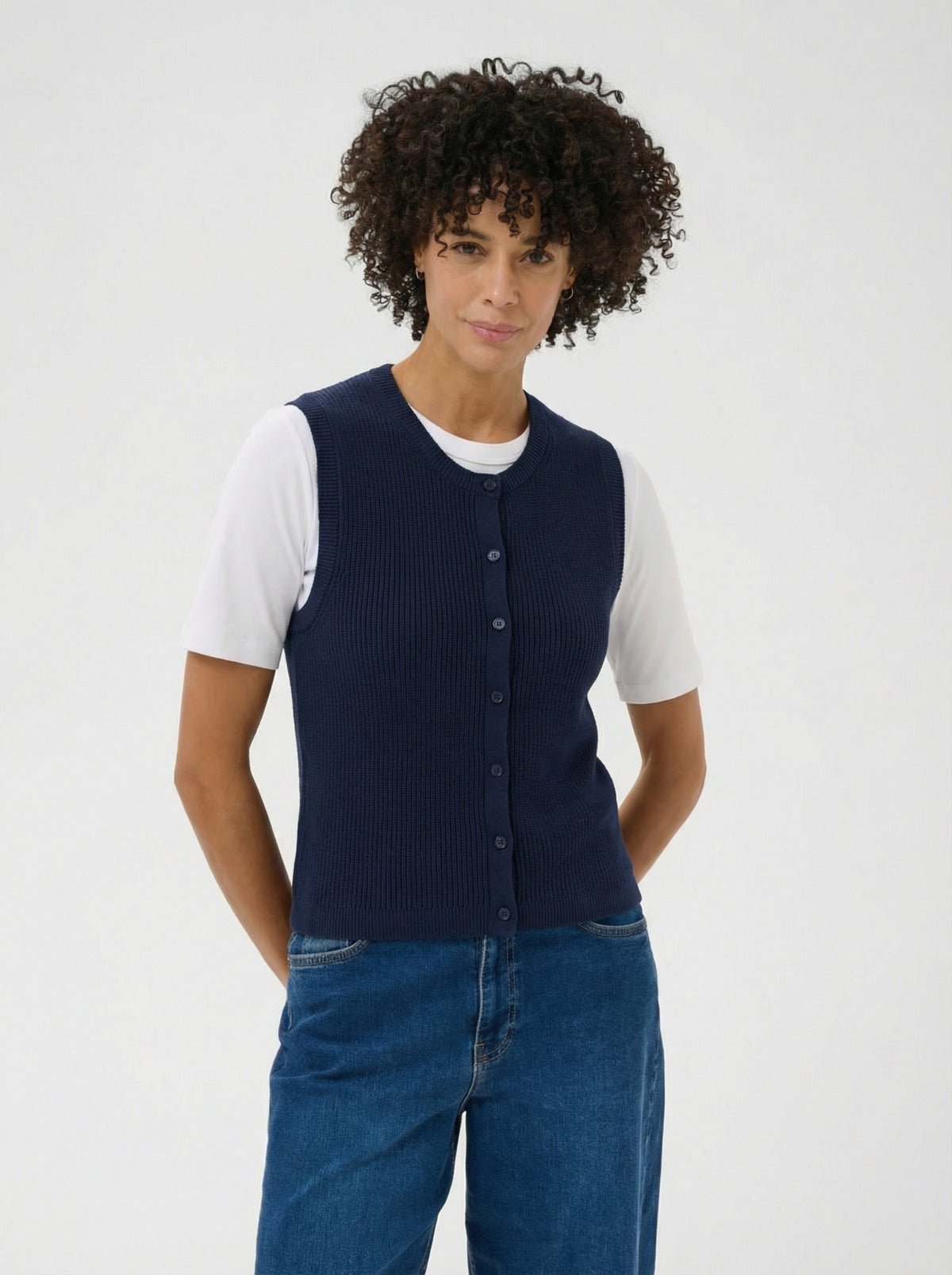 Superposez cette pièce tricotée en coton biologique pour ajouter une texture subtile et une chaleur légère à vos tenues quotidiennes. Sa coupe structurée et sans manches en fait un essentiel polyvalent, facile à porter seul ou par-dessus une chemise pour un look chic et décontracté. Sa matière naturelle garantit un confort respirant tout au long de la saison.