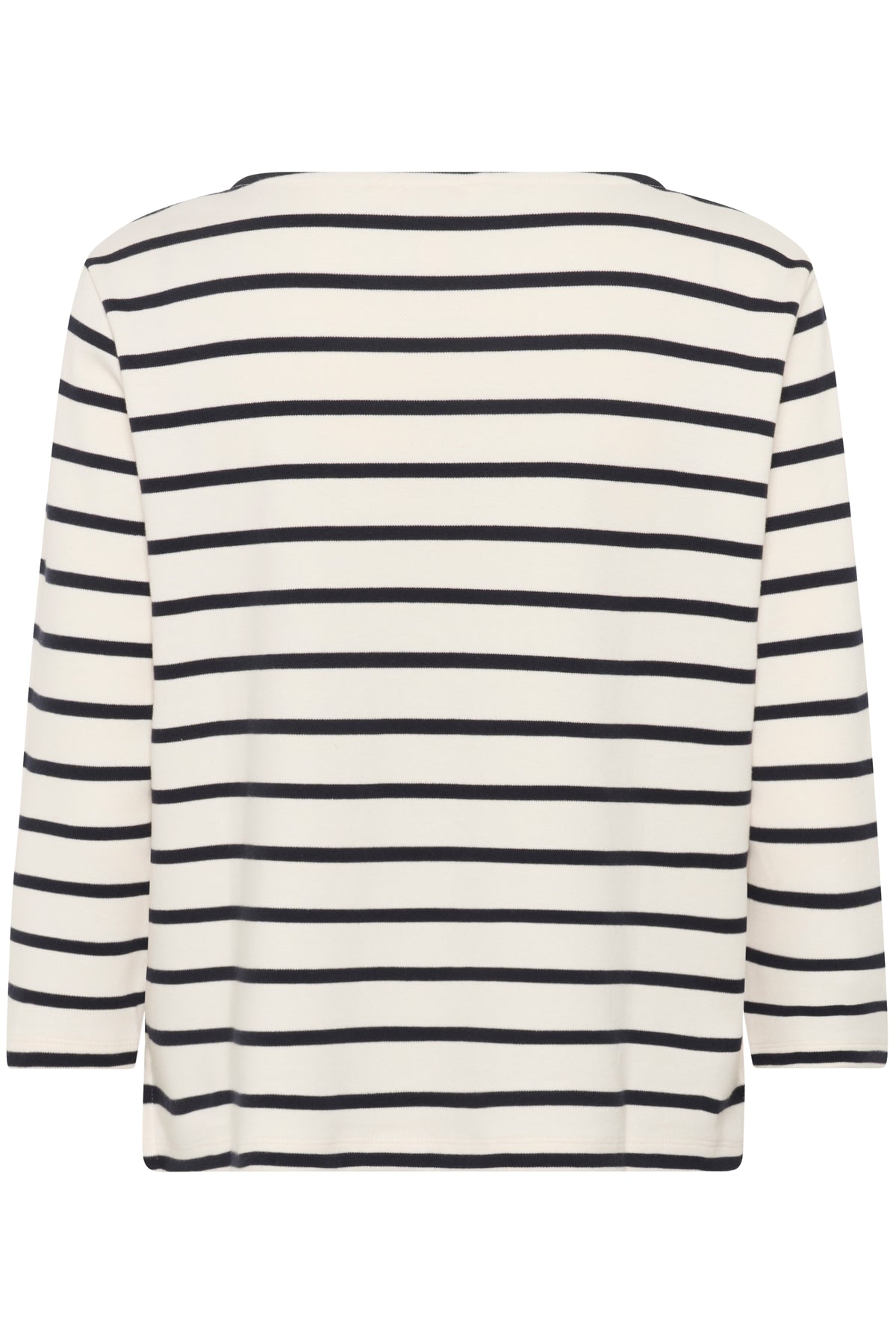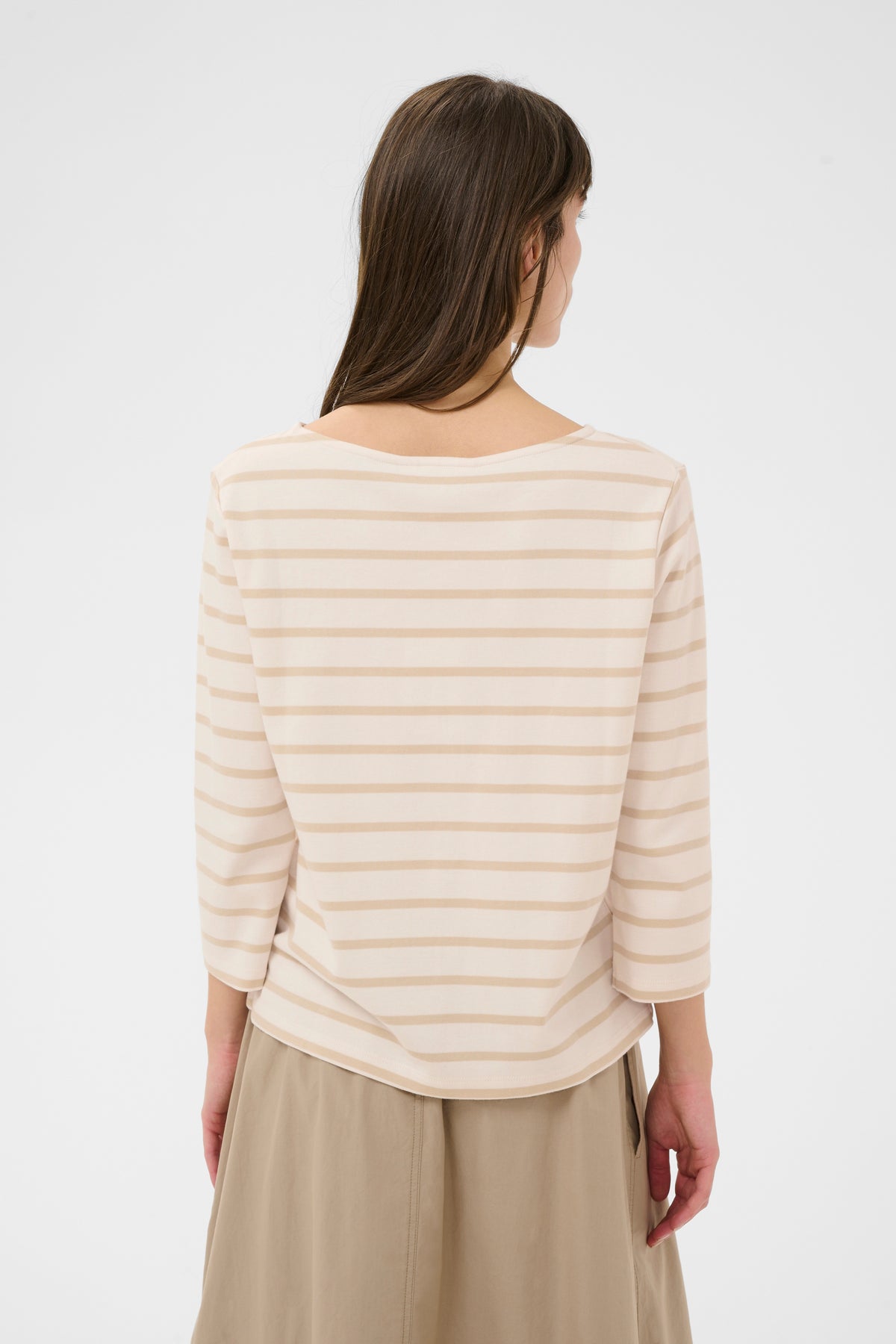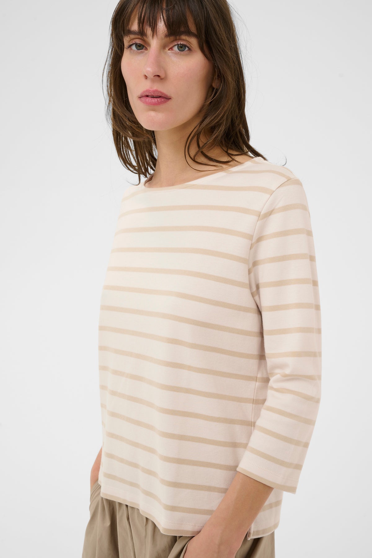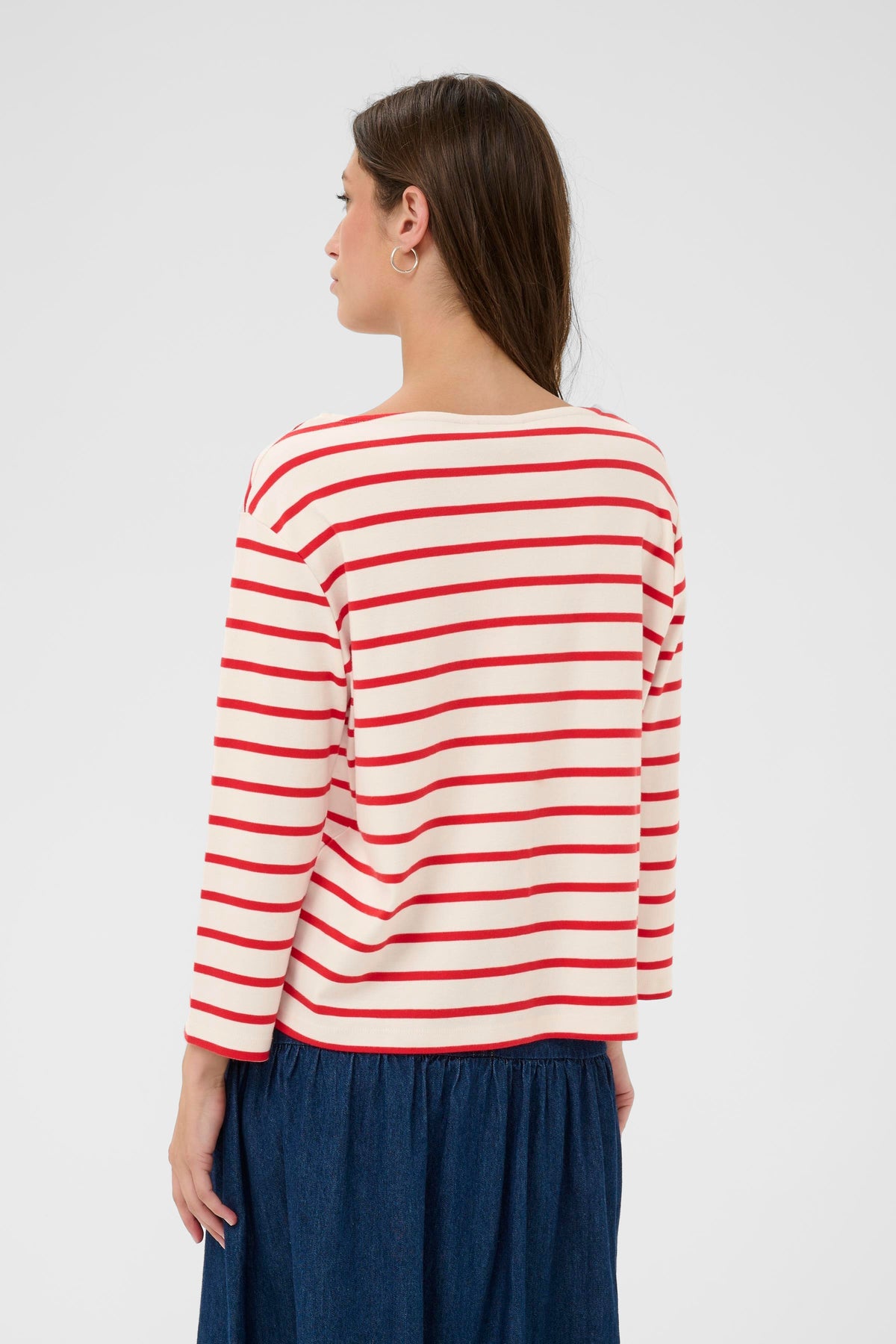 Son col bateau, subtilement dégagé, s’inspire des silhouettes classiques. Les rayures, équilibrées et intemporelles, apportent du rythme au tissu. Léger tout en offrant une belle tenue, il accompagne confortablement les mouvements du quotidien. Un essentiel durable, facile à porter saison après saison.
