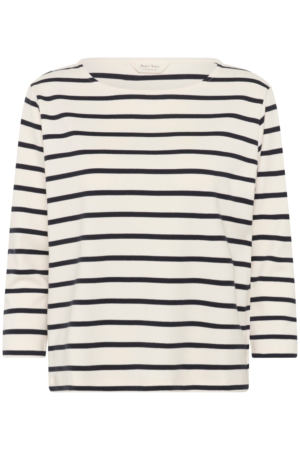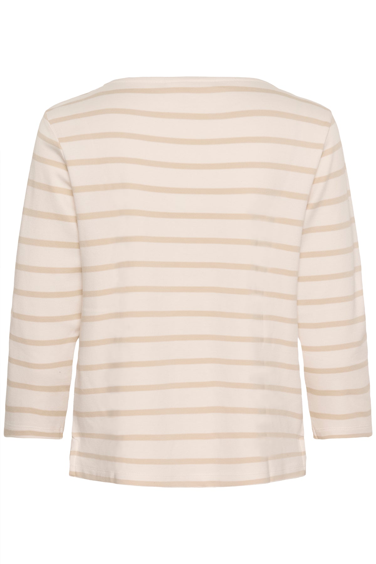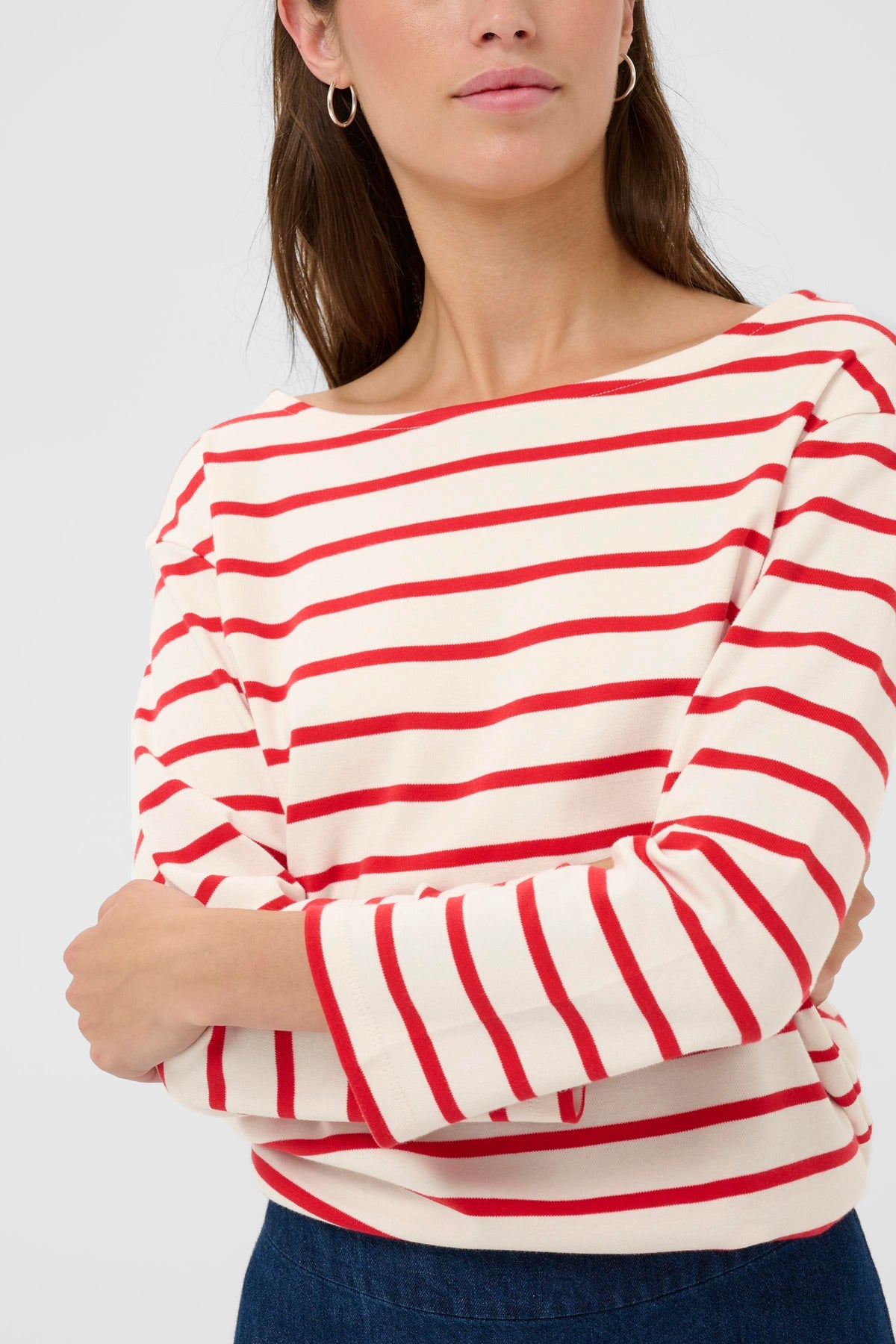 Son col bateau, subtilement dégagé, s’inspire des silhouettes classiques. Les rayures, équilibrées et intemporelles, apportent du rythme au tissu. Léger tout en offrant une belle tenue, il accompagne confortablement les mouvements du quotidien. Un essentiel durable, facile à porter saison après saison.