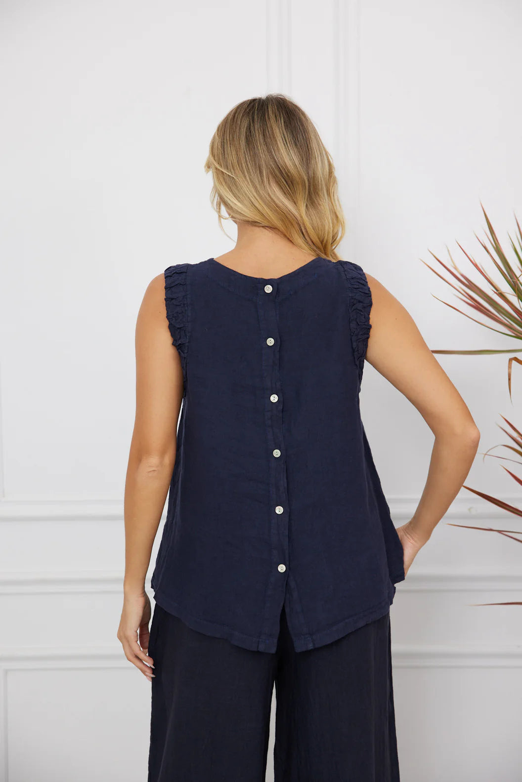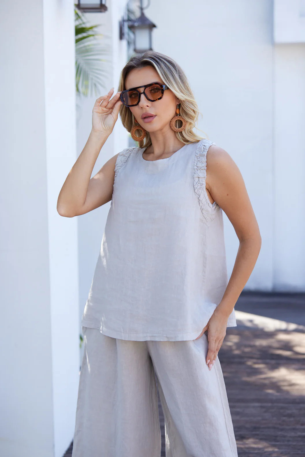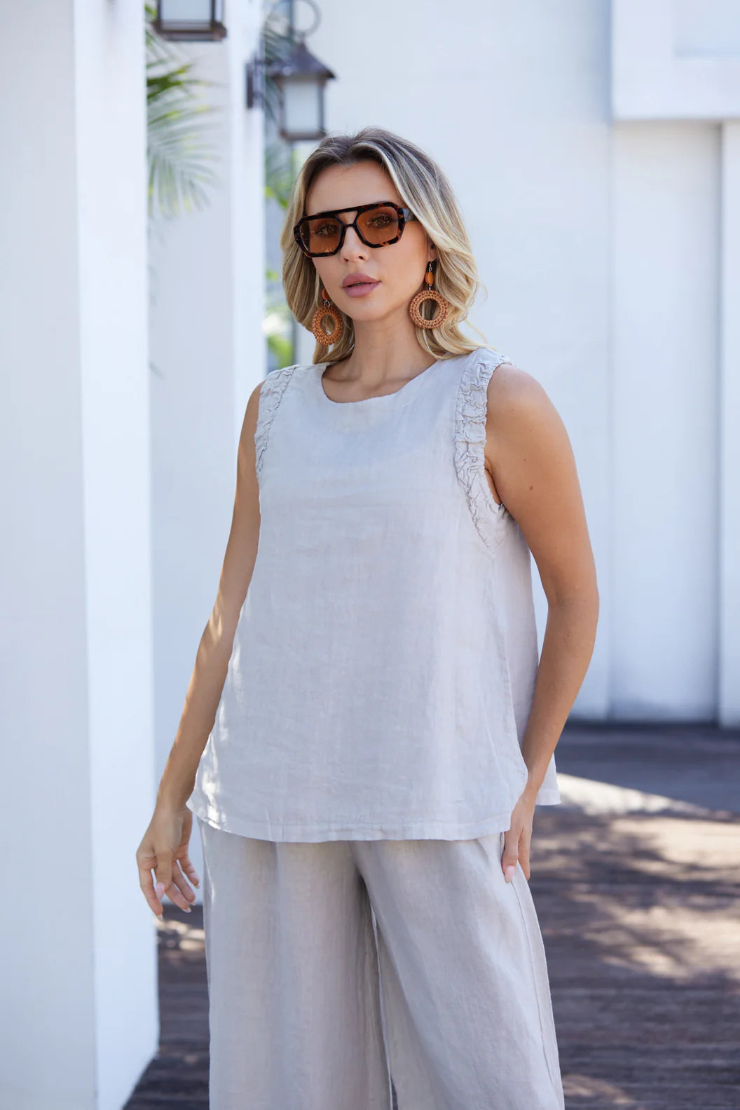 Ce haut sans manches combine confort et allure moderne grâce à ses ouvertures élastiques qui créent un effet froncé délicat. Sa silhouette décontractée le rend idéal pour les journées chaudes, les superpositions ou les ensembles avec jupes et shorts. Facile à styliser, il devient rapidement un essentiel polyvalent du vestiaire.