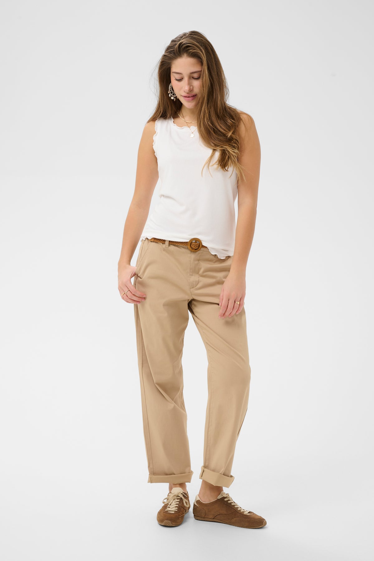 Ce haut sans manches mise sur la simplicité et la légèreté. Son mélange de viscose et d’élasthanne offre un tissu souple et confortable qui accompagne les mouvements. La coupe ajustée souligne la silhouette sans restreindre, tandis que le style camisole apporte une allure épurée, facile à superposer ou à porter seule.