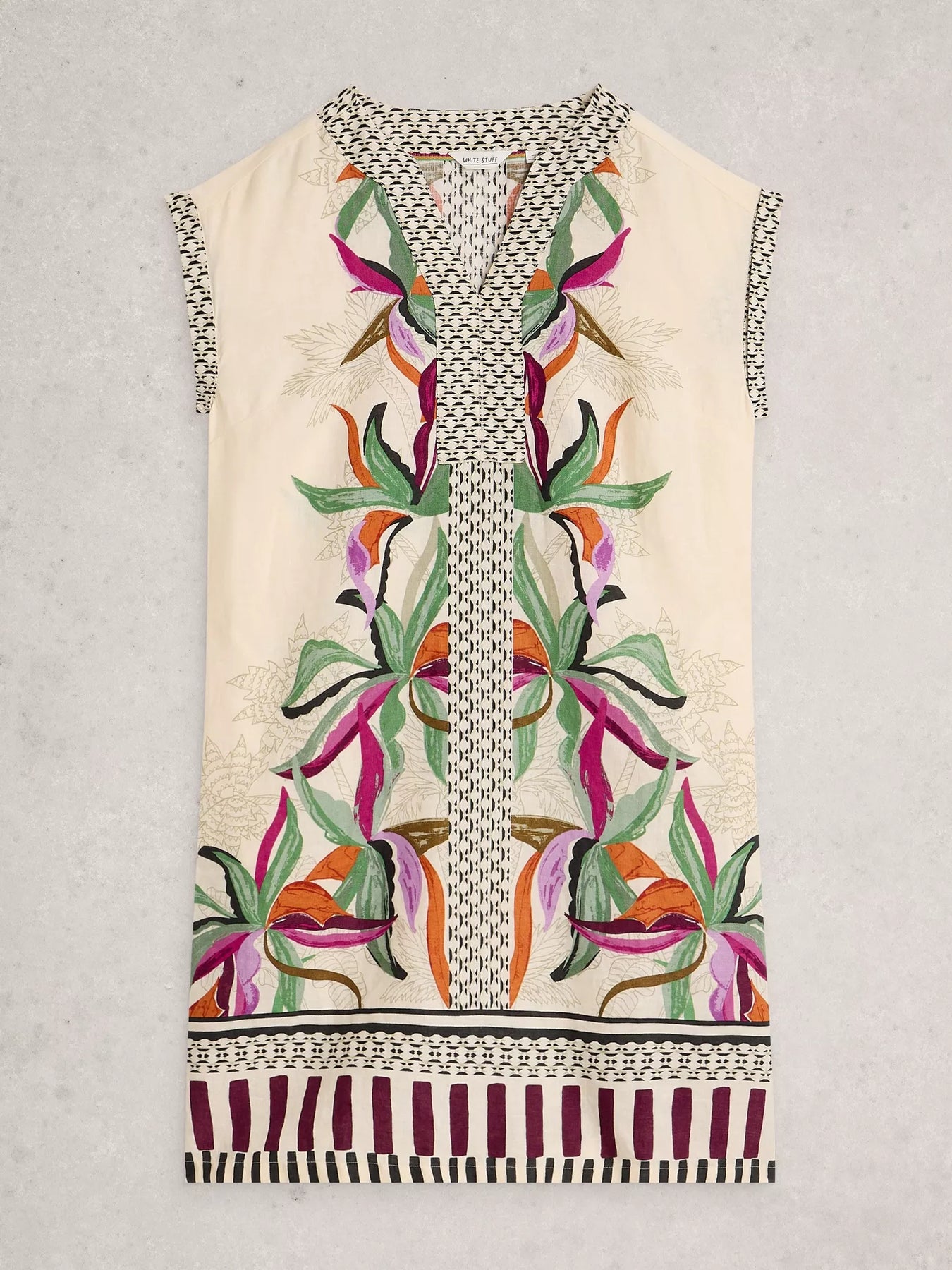 Entièrement réalisée en pur lin, elle garantit une fraîcheur exceptionnelle et une légèreté indispensable lors des journées de canicule. Ce modèle se distingue par ses finitions graphiques contrastées au col et aux emmanchures, structurant avec élégance sa coupe "shift" décontractée. Facile à enfiler et à styliser, elle se marie parfaitement avec des sandales et vos lunettes de soleil préférées pour un look estival à la fois soigné et sans effort.