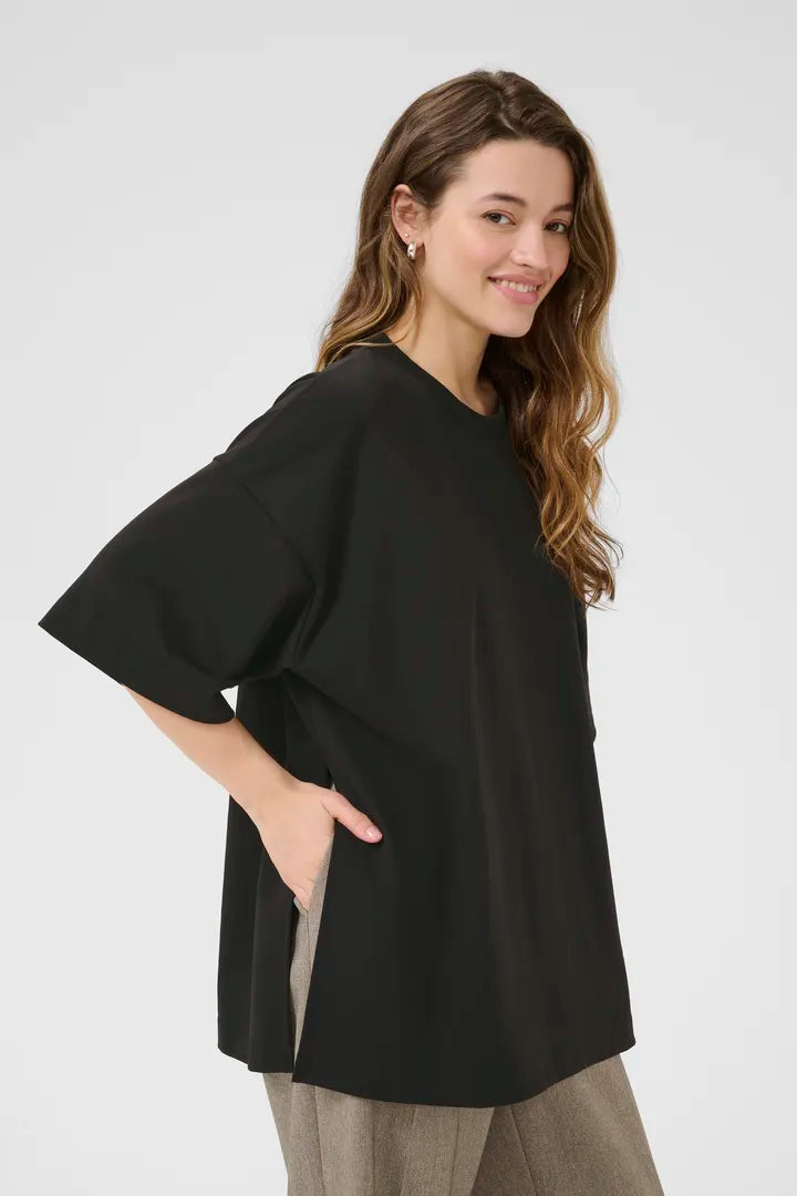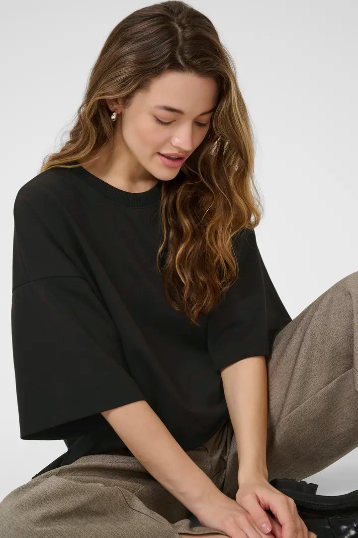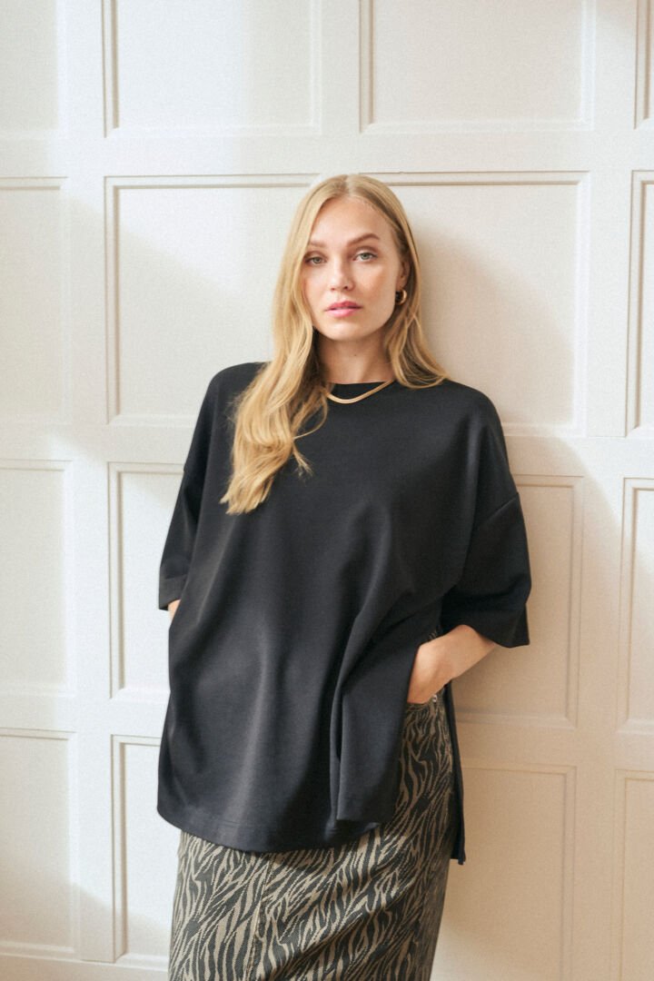 Léger, ample, et terriblement à la mode, ce t-shirt boyfriend réinvente le confort avec une dose assumée de nonchalance. Sa coupe décontractée, inspirée du vestiaire masculin, flotte avec aisance autour du corps tout en insufflant une allure moderne et désinvolte. Porté rentré dans un jean taille haute ou lâché sur un short, il incarne ce mélange parfait de simplicité et d’attitude. C’est le genre de pièce qu’on emprunte une fois… et qu’on ne rend jamais.