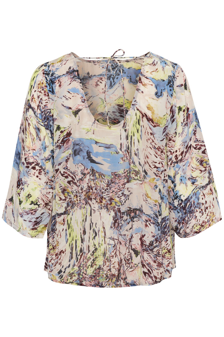 Conçue pour celles qui apprécient l'élégance artistique et la fluidité intemporelle, cette blouse est une célébration de la couleur, de la lumière et de l'émotion capturée sur toile. Les tons de bleu, crème, vert et brun se mélangent pour créer un véritable tableau d'art vivant.