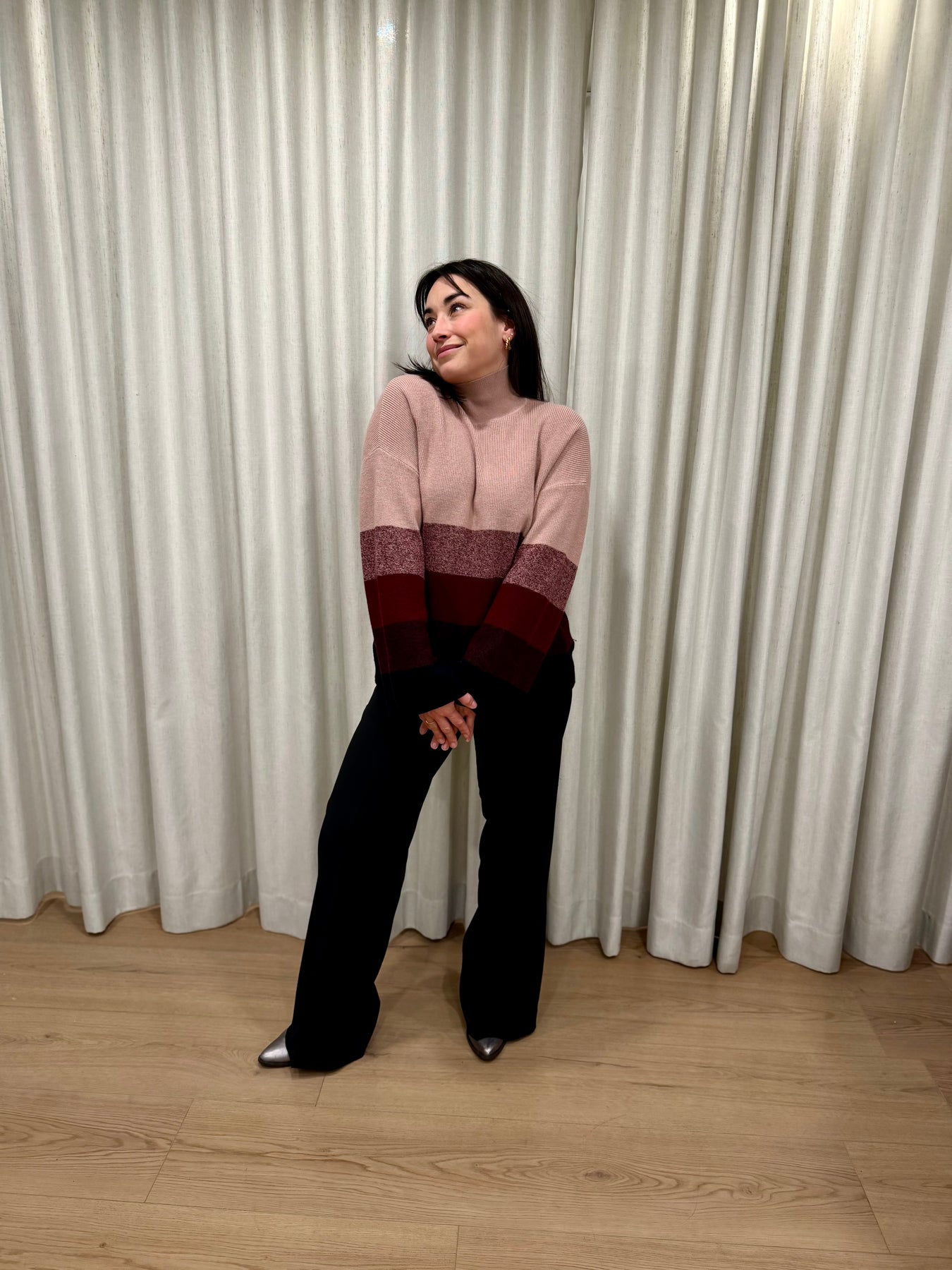 Chaud et tout en douceur, ce pull à col montant séduit par son jeu de rayures dégradées dans des tons chauds de bordeaux intemporels. Sa maille souple et confortable enveloppe la silhouette, tandis que sa coupe ample assure une grande liberté de mouvement. Le col montant apporte une touche cosy, idéale pour les journées fraîches. À associer avec un jean droit ou une jupe en maille pour un look d’automne chic et facile à porter.