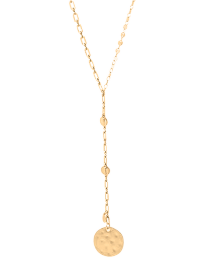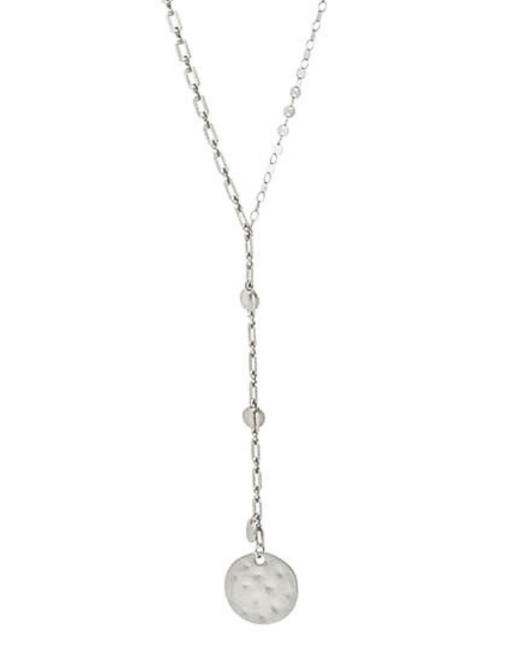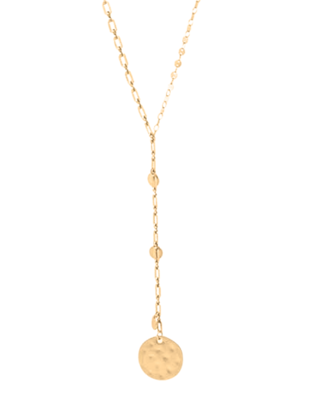 Ce collier long avec un pendentif en forme de cercle martelé offre une fusion unique de styles de chaînes. L'assemblage de maillons variés, associé à la finition mate et aux détails martelés des cercles et des rectangles, confère à cette pièce une élégance simple et raffinée.
