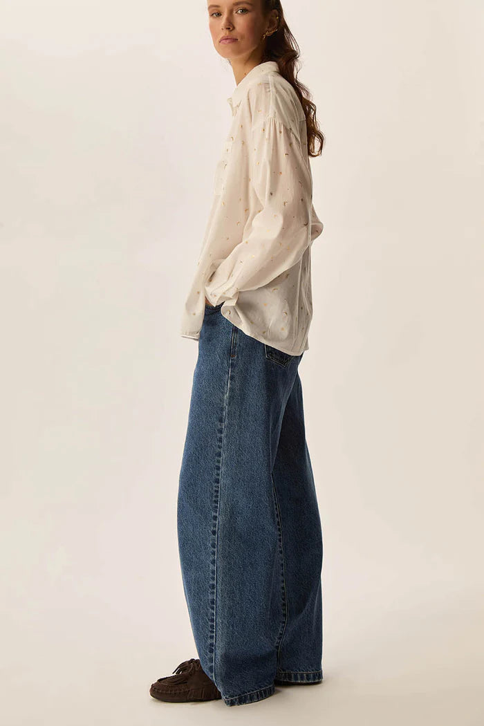 Cette chemise à la coupe droite et ample se distingue par son imprimé exclusif de soleils et lunes dorés. Sa matière en coton twill offre confort et élégance, parfaite pour un look à la fois féminin et décontracté.