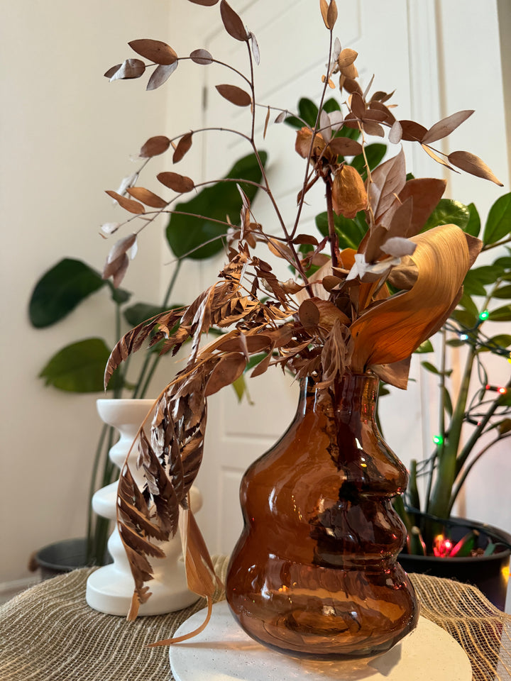 Ce vase abstrait en verre brun s’inspire des formes organiques d’un vase en argile affaissé, créant un équilibre parfait entre modernité et rusticité. Avec sa silhouette fluide et ses courbes douces, il évoque la beauté brute de la nature tout en apportant une touche de sophistication à votre espace. Sa teinte profonde et sa texture subtile captent la lumière d’une manière unique, ajoutant une dimension artistique à n'importe quelle pièce. Idéal pour mettre en valeur des fleurs séchées ou simplement en tant que pièce maîtresse, il incarne l’élégance discrète et intemporelle.